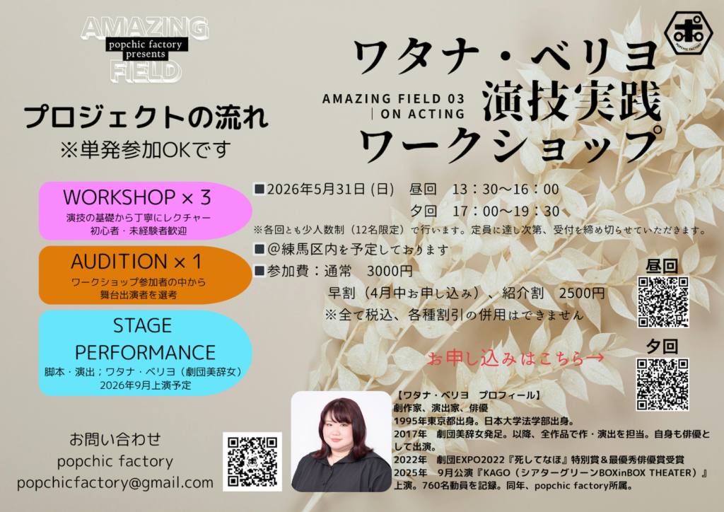 また、本ワークショップは今秋予定しているの舞台本番に向けたプロジェクトの一環となっており、オーディションへの参加機会および出演のチャンスがあります。現場に近い環境での体験を通して、自身の可能性を広げていただけます。